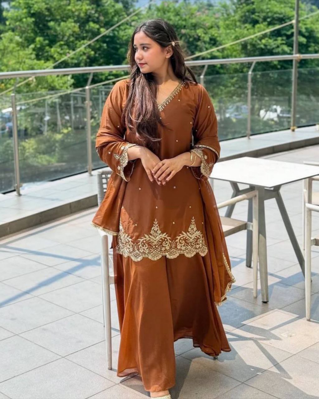 Ready To Wear Caramel Soft Georgette Embroidery Work Palazo Suit With Dupatta
