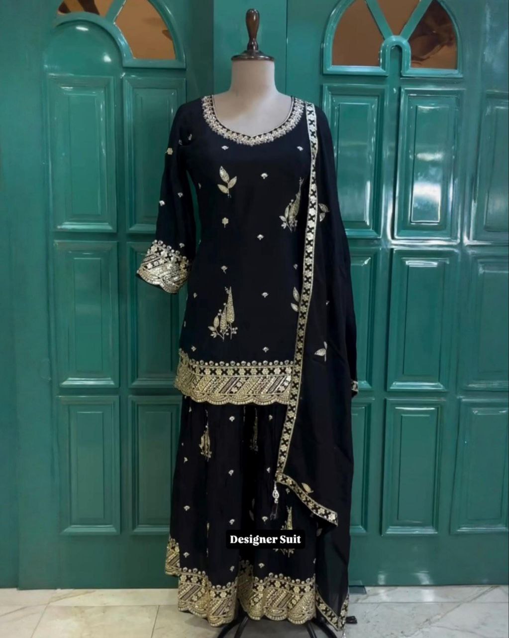 Ready To Wear Fanta & Black Chinon Silk Embroidery Work Sharara Suit With Dupatta