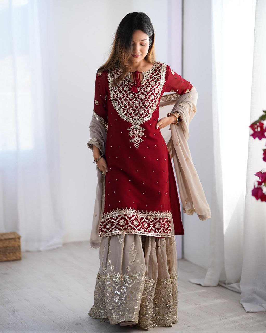 Ready To Wear Maroon Soft Georgette Embroidery Work Gharara Suit With Dupatta